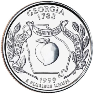 The 1999 “Georgia Peach” is a stunningly beautiful design, with the round thing in the center and the budding leaves surrounding, withal, espousing “Wisdom”, “Justice” and “Moderation” — the last of which is my cup of tea, as in, “Just … just … just take it easy”, a great coin to carry or wear to avoid conflict, connects quite well to the “Omphalos” or “Navel of the World” — planetary belly-button, as it were, of the Ancients, notably the Oracle at Delphi, also a good connection for this coin.
