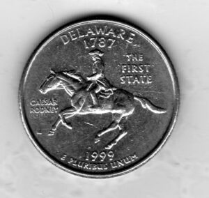 The 1999 Delaware quarter features “Caesar Rodney” — great for horse-country like ours, this horse & rider can be worth up to $5,000 if you manage to stumble across the variant with the double name “Caesar Rodney”, celebrating his famous nightride through a powerful storm in order to break the deadlock vote on American Independence on the night of July 1, 1776, arriving in Philadelphia to vote in favor of the resolution.